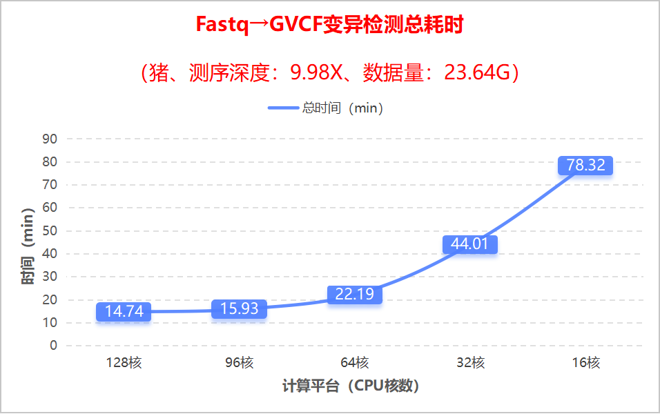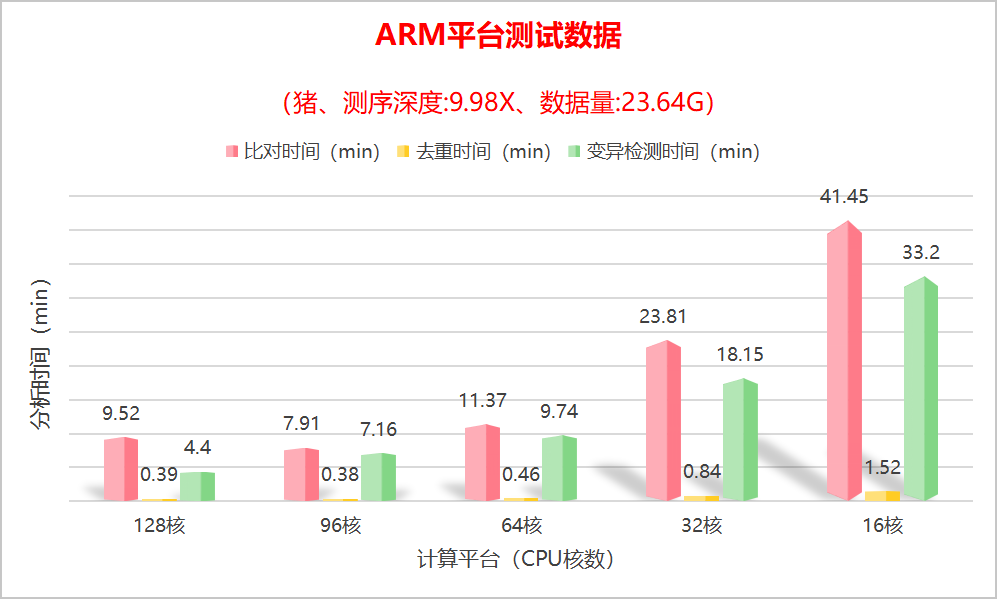 ### Ⅰ、测试物种信息 **1. 测试物种**:猪(Sus scrofa) **2. 物种倍性**:二倍体 **3. 测试数据**:自有数据 **4. 测序平台**:/ **5. Raw_Reads**:157609730 **6.Raw_Bases**:23.64G **7.测序深度**:9.98X **8.参考基因组**:Sus_scrofa.Sscrofa11.1.dna.toplevel.fa **9.参考基因组大小**:2.37G **10.测试流程**:从Fastq到VCF全分析流程 ### Ⅱ、测试环境 **1. 测试平台**:Ampere 2U机架式服务器(工程验证机) **2. CPU型号**:单颗ApereOne A192-32X(ARM架构、192个内核、基准主频3.2GHz) **3. 内存配置**:512GB **4. 系统环境**:Ubuntu 24.04 **5. 测试方案**:为了确保测试结果的准确性和可比性,我们将采用相同的测序数据及参考基因组,并在同一测试环境下,通过调整不同CPU核心数量(16核、32核、64核、96核、128核)来执行分析任务,记录各分析环节所需时间; ### Ⅲ、测试结论(分项时间)  ### Ⅳ、测试结论(总耗时)  ### Ⅴ、测试分析流程步骤 http://doc.insvast.com/doc/21/ ### Ⅵ、联系我们  官网:www.chsnp.com 邮箱:info@chsnp.com 电话:020-22076772 地址:广州市番禺区南村镇汇智二路236号华新汇1座2803单元